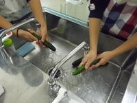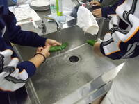 本日、2年6組の家庭科の学習では、きゅうりを使った包丁の技能テストがありました。