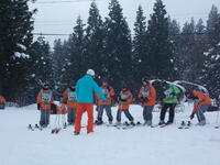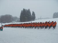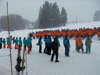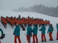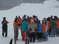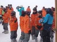 雪が舞う中、生徒たちはインストラクターの話を聞き、早速板をはき出発です。