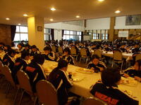 その後、夕食です。本日のメニューは牛すきです。新潟産コシヒカリがとても美味しく、お替りの行列が今日もできていました。