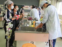 包丁・まな板を配り、十分に手洗い。分担に従って進めていきます。家での経験値が現れる?