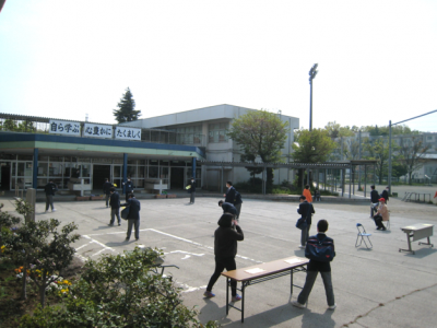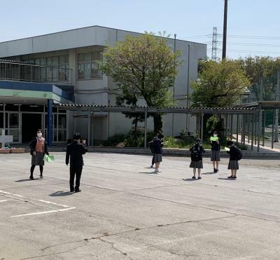 本日は、玄関前で教員との密接を避けるため、テーブルに名簿を置いて各自で取るようにしました。2m距離を開けて整然と登校、素晴らしい!